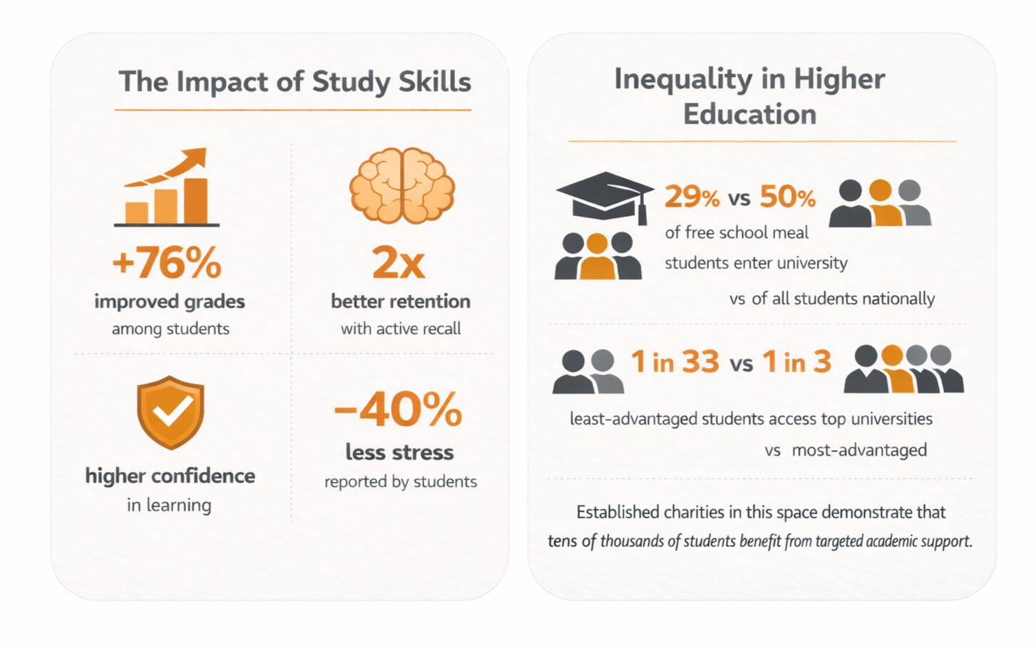 What informs and drives our workStudents from the most advantaged backgrounds have about a 1 in 3 chance of attending the most competitive UK universities, compared with 1 in 33 for the least advantagedResearch on metacognition, memory, and effective learning strategies prove to overcome these barriers.Where our research stems from:The practice of education charities such as IntoUniversity, Sutton Trust, and The Brilliant ClubConversations with students and teachers about what support is actually usefulReal-world experience delivering talks and mentoring students on learning and performance